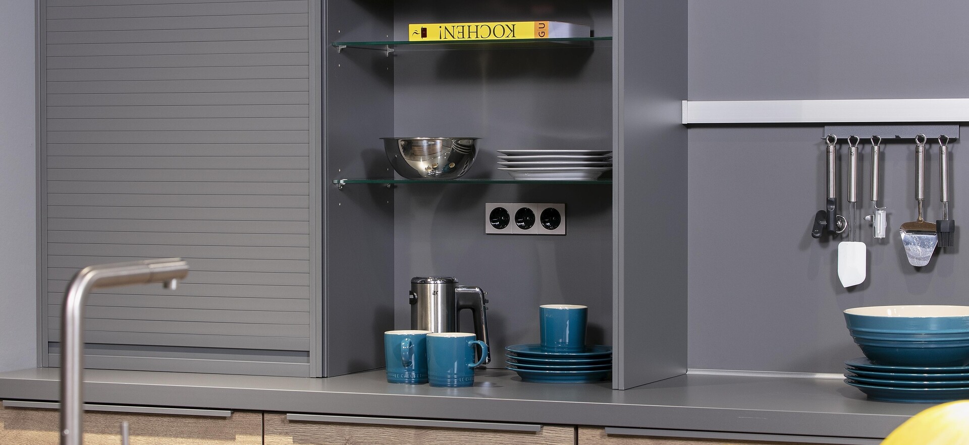Das nebenstehende Küchenbeispiel zeigt, wie praktisch das ist: Vieles, das man täglich benötigt, kann hier staub- und schmutzsicher den Blicken entzogen und trotzdem griffbereit verstaut werden. Und der Rolladen arrretiert an jeder Stelle, kann also halb, ganz oder nur zu einem Drittel aufgeschoben werden. Ganz ohne dass im geöffneten Zustand Türen im Weg sind :-)