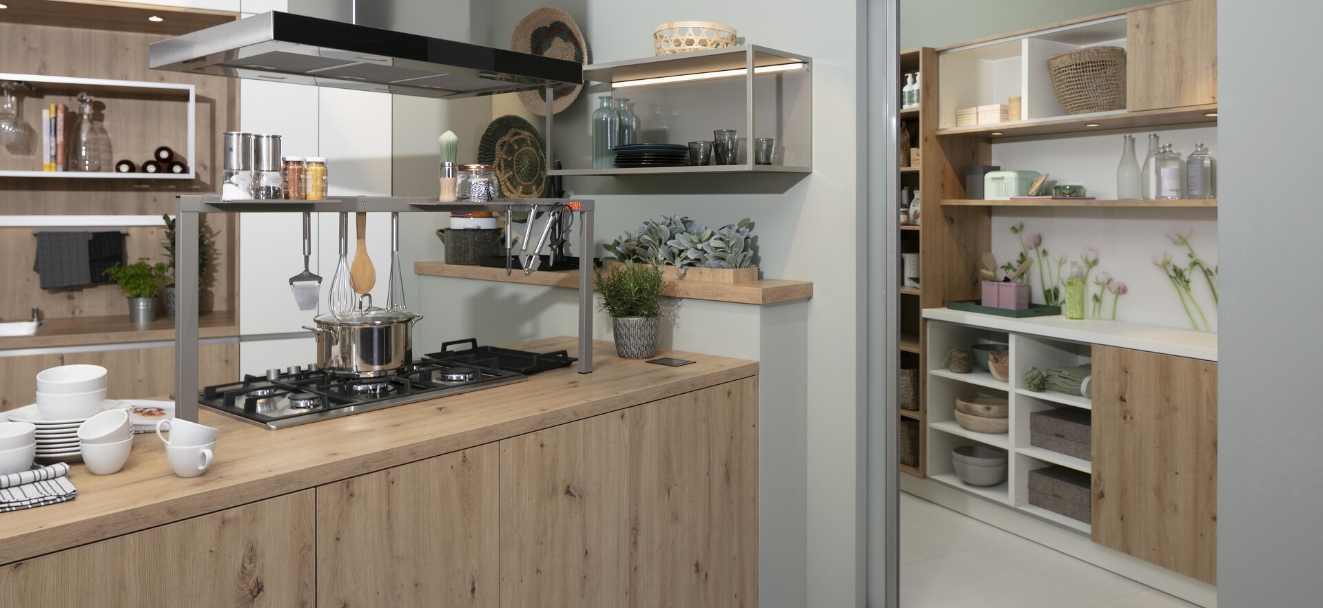 Ist die Grundfläche Ihrer Küche groß genug, um davon etwas abzuzwacken und damit eine kleine Vorratskammer zu gewinnen? – Getränkekisten, Plastikmülltüten, Konserven und andere Vorräte wären dann gut verstaut, ohne die Optik der Küchengestaltung zu trüben. Vorteil abgetrennter Abstellräume ist es ja auch, dass hier alles offen in Regalen lagern kann, auf die man superfixen Zugriff hat.